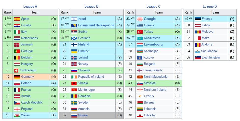 Jeśli w danej lidze są mniej niż cztery zespoły, które nie wywalczyły bezpośredniego awansu w kwalifikacjach, wówczas do danej ścieżki trafia najlepszy zespół klasyfikacji ogólnej dywizji „D” Ligi Narodów, chyba że uzyskałby on bezpośredni awans, to wtedy nie. W tym przypadku jest to Estonia. Co więcej, jeśli w danej lidze są mniej niż trzy drużyny bez awansu na EURO, wówczas do tej ścieżki barażów trafia kolejny najlepszy zespół z klasyfikacji ogólnej Ligi Narodów bez podziału na dywizje. Chyba że w danej ścieżce jest zwycięzca grupy Ligi Narodów, to wtedy jest dobierany najlepszy zespół z niższej ligi. Nie może to być jednak zwycięzca swojej grupy i co oczywiste, musi to być zespół, który nie wywalczył bezpośredniego awansu. Teraz przykład. Jeśli z zespołów grających w dywizji „A” LN tylko dwie reprezentacje nie uzyskają bezpośredniego awansu, wówczas do ścieżki zostanie dokooptowany najlepszy zespół dywizji „D” (Estonia) oraz najlepszy zespół ogólnej klasyfikacji LN niebędący zwycięzcą swojej grupy, czyli któryś z zespołów z dywizji „B”. Zostanie on dobrany poprzez losowanie, pamiętając, że do dywizji „A” nie może trafić zwycięzca grupy z dywizji „B”. Na ten moment do ścieżki „A” trafi ktoś z trójki Finlandia, Ukraina i Islandia. Pewni gry w barażach w ścieżce „B” są Izrael i Bośnia i Hercegowina, którzy są zwycięzcami swoich grup LN.