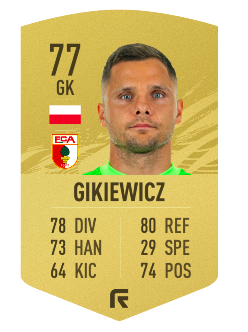 Rafał odszedł z Unionu Berlin, któremu udało się utrzymać w Bundeslidze i przeniósł się do Augsburga. Jego overall podskoczył o 2 oczka i wynosi teraz 77 punktów. Gikiewicz zajmuje 922 miejsce w klasyfikacji najlepszych kart. Miejmy nadzieję, że Polak, mimo 33 lat na karku, będzie dalej się rozwijać, a wraz z nim jego overall.