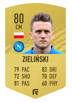 Kolejny spadek overalla, tym razem o jedno oczko. Miejmy nadzieję, że w sezonie 2020/2021 Zielińskiemu w końcu coś przeskoczy w głowie i znowu będziemy mogli oglądać go w FIFIE w oceną 80, jak i wyższą.
