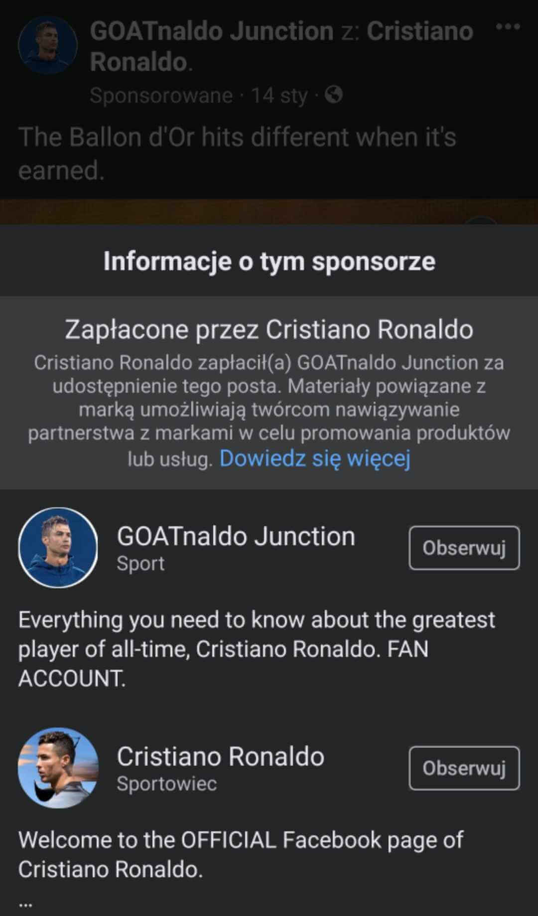 Co ciekawe screeny nie są nieprawdziwe. W opisie sponsora postu pojawia się oficjalne konto Cristiano Ronaldo.