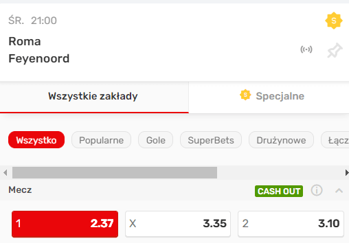 - Zagrać za 2 zł z konta głównego na zwycięstwo Romy lub Feyenoordu ze standardowej oferty bukmachera. Poniżej przykład na zwycięstwo rzymian.