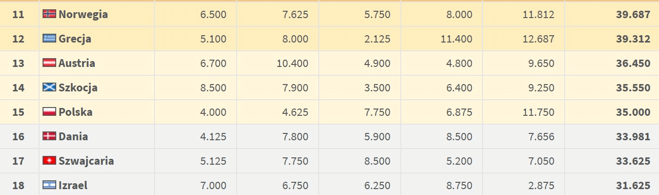 Co więcej, niewiele brakowało, a Polska znalazła by się jeszcze wyżej. Do 14. pozycji, którą zajmuje Szkocja, zabrakło zaledwie 0,550 pkt. Wiadomo już, że nikt naszego kraju nie zdoła w tym sezonie wyprzedzić. Dania, Szwajcaria czy Izrael, nie mają już swoich przedstawicieli w Europie.