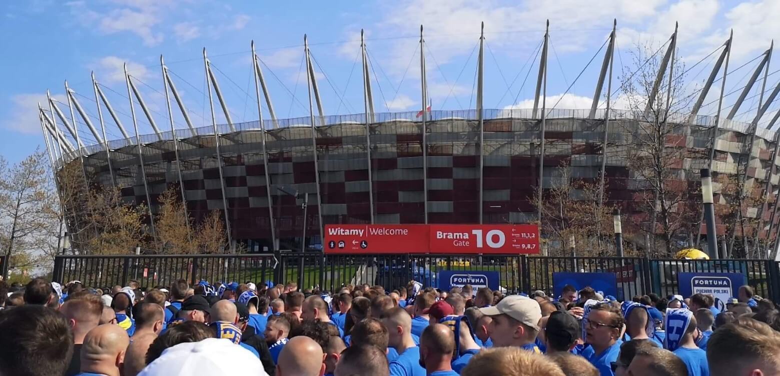 Postanowiłem wybrać się z grupą fanatyków Kolejorza na finał Pucharu Polski, aby obejrzeć spotkanie z ich perspektywy. Niestety meczu prawie nikt nie zobaczył. Przepuszczono pojedyncze osoby z dziećmi, reszta musiała stać w kilkutysięcznym tłumie pod bramą nr 10.