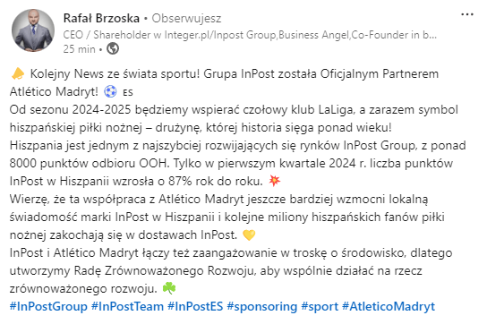 We wtorek przed południem firma InPost ogłosiła nawiązanie współpracy z Atlético Madryt. Oficjalne potwierdzenie partnerstwa pojawiło się na profilach społecznościowych Rafała Brzoski, założyciela i prezesa firmy.