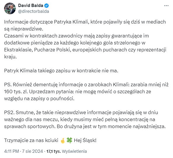 Na medialne spekulacje szybko zareagował dyrektor sportowy Śląska Wrocław. David Balda stwierdził, że informacje o rzekomych premiach dla Klimali za gole w trzeciej lidze są nieprawdziwe.