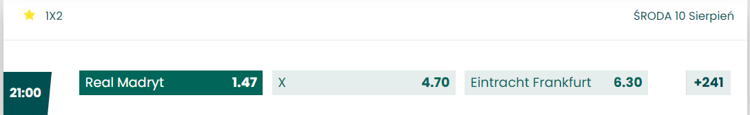 - Zagrać za 25 zł na zwycięstwo Realu Madryt w kuponie z jednym zdarzeniem lub kilkoma innymi. Ważne, abyś na kuponie zawarł zakład z tej oferty -> TUTAJ.