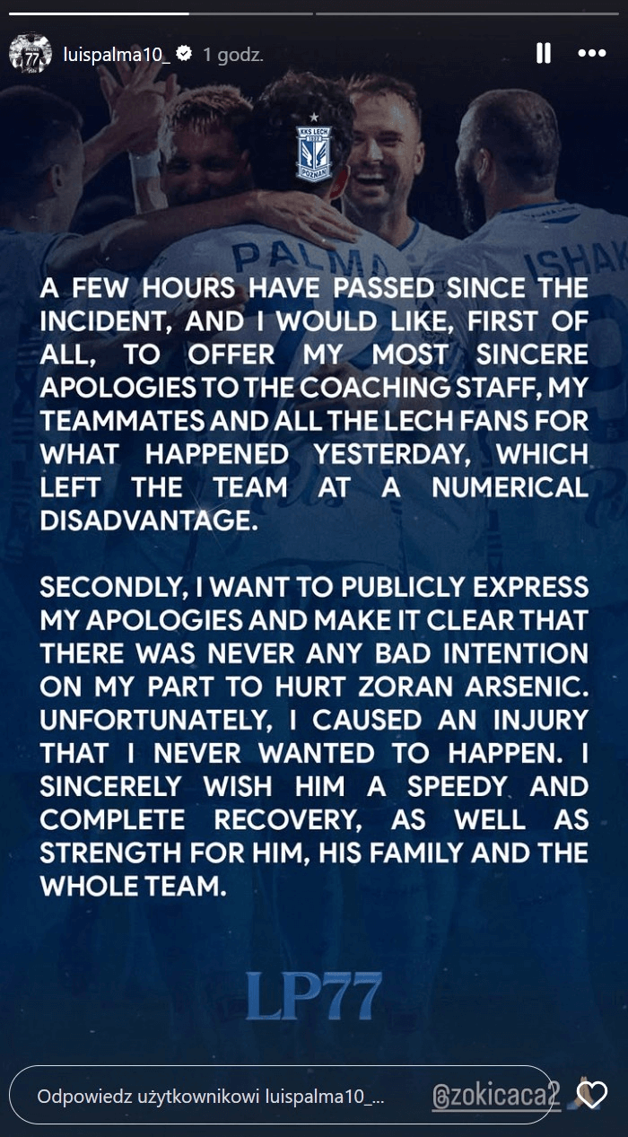 Na Instagramie oficjalne przeprosiny postanowił wystosować z kolei Palma. Gracz Lecha publicznie skierował się do Arsenicia, zapewniając, że nie chciał zrobić rywalowi krzywdy.