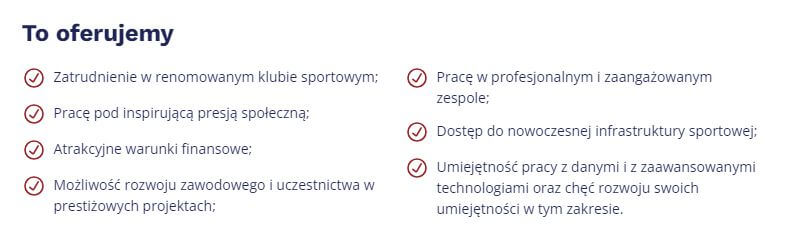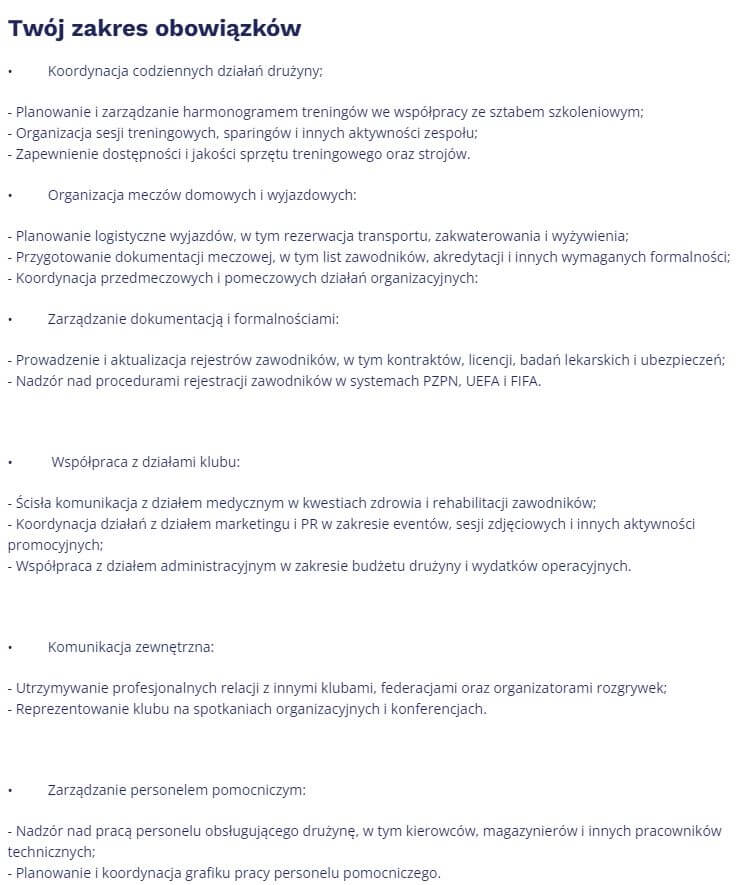 W ogłoszeniu znajdziemy podstawowe informacje odnośnie pracy na wspomnianym stanowisku. Możemy dowiedzieć się szczegółów o zakresie obowiązków, wymaganiach klubu oraz o tym, co klub jest w stanie zaoferować potencjalnemu pracownikowi. Pełną ofertę znajdziecie TUTAJ.